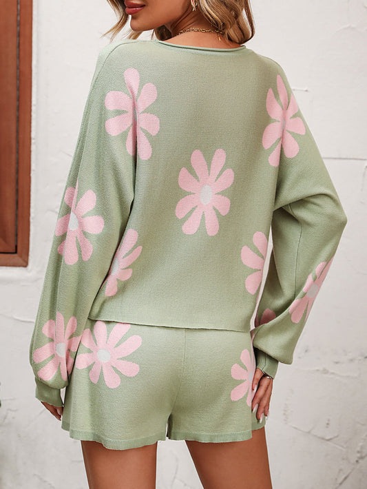 I didn't want to go Floral Print Raglan Sleeve Knit Top and Tie Front Sweater Shorts Set